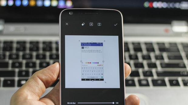 Bước 1: Mở một tấm hình có phông nền màu trắng, chọn mục Thêm ảnh và thêm tấm hình trang cá nhân hoặc status của bạn vừa chụp ở trên vào > Sau đó, ấn vào dấu tít ở góc phải để xác nhận lưu lại.