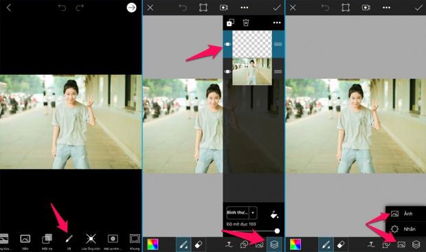 Bước 2: Dưới thanh công cụ, chọn chức năng 'Vẽ' để chuyển sang giao diện ghép ảnh > Thêm layer > nhấn biểu tượng hình chữ nhật theo minh họa và chọn Ảnh