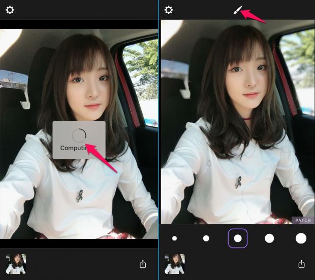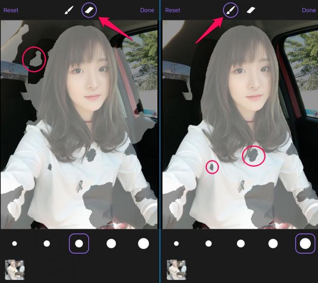 Quá trình phân vùng xóa phông sẽ được tiến hành tự động. Nhấn vào biểu tượng cây bút ở góc trên màn hình để chuyển sang chế độ tùy chỉnh thủ công, chỉnh sửa lại những khu vực bị nhận dạng sai. Phần màu trắng sẽ không bị làm mờ và ngược lại