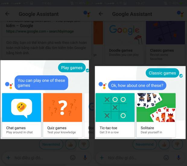 Ngoài ra, Google Assistant còn có thể cho người dùng chơi game ngay tại đây. Khi người dùng soạn Play a Game, trợ lí sẽ để xuất những thể loại cho bạn lựa chọn. Mọi người có thể nhấn vào để chơi ngay lập tức.
