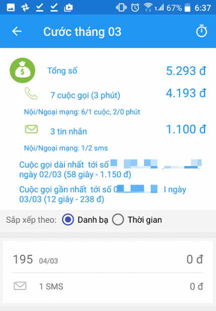 Bây giờ bạn có thể xem lại tổng kết cước phí đã dùng trong tháng trong mỗi hạng mục.
