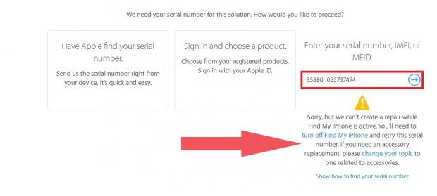 'Sorry, but we can't create a repair while Find My iPhone is active. You'll need to turn off Find My iPhone and retry this serial number. If you need an accessory replacement, please change your topic to one related to accessories.'