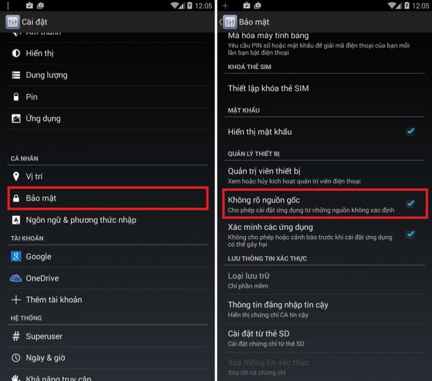 Bước 1: Trên điện thoại Android, bạn truy cập vào Cài đặt > Bảo mật > Sau đó chọn vào 'Cho phép cài đặt ứng dụng không rõ nguồn gốc'.
