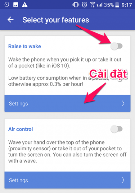 Bên cạnh tính năng chính là Raise to wake bạn cũng có thể thử thêm Air control cho phép bật tắt sáng màn hình bằng cách 'vẫy' tay trước màn hình điện thoại, khá thú vị. Tuy nhiên tính năng này khá tốn pin, mình sẽ không đề cập đến ở đây.