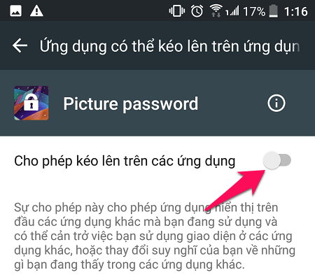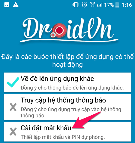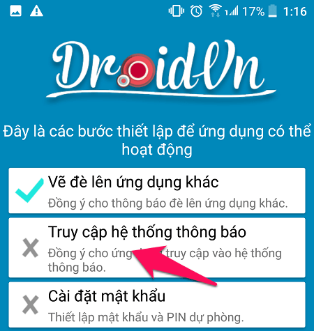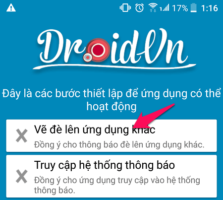 Đầu tiên bạn cần thiết lập một số quyền cho ứng dụng, chọn Vẽ đè lên ứng dụng khác.