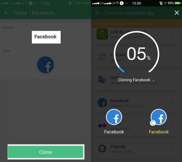 Tiếp theo, các bạn có thể đặt tên lại cho ứng dụng đó và nhấn Clone. Clone Master sẽ tiến hành tạo bản sao cho app bạn vừa chọn. Quá trình này diễn ra nhanh hay chậm còn phụ thuộc vào cấu hình smartphone cũng như dung lượng ứng dụng bạn chọn.