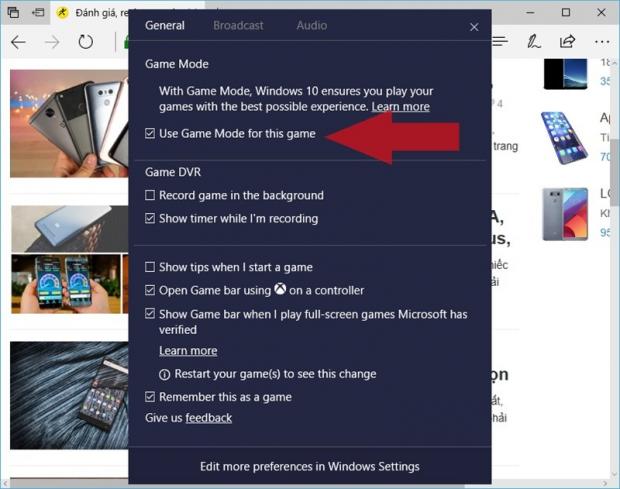 ...tiếp đến tích chọn vào 'Use Game Mode for this game' > Nhấn X để thoát và nhấn vào biểu tượng quay (màu đỏ) để bắt đầu.