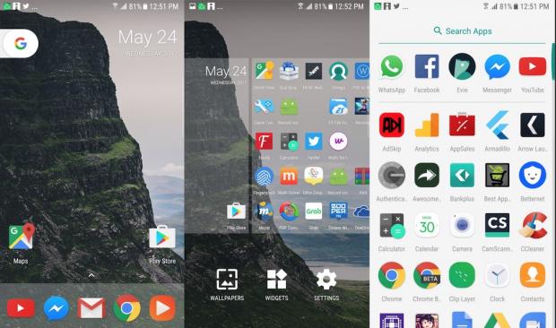 Nhìn chung, Google Pixel O Launcher có giao diện khá đơn giản, trực quan dễ làm quen. Ngay màn hình chính sẽ có công cụ tìm kiếm Google và ở góc phải là đồng hồ hiển thị rất tinh tế. Để truy cập ứng dụng trong app drawer thì bạn vuốt từ dưới lên, hoặc có thể kéo thả ứng dụng để mang ra màn hình ngoài để sử dụng nhanh hơn.