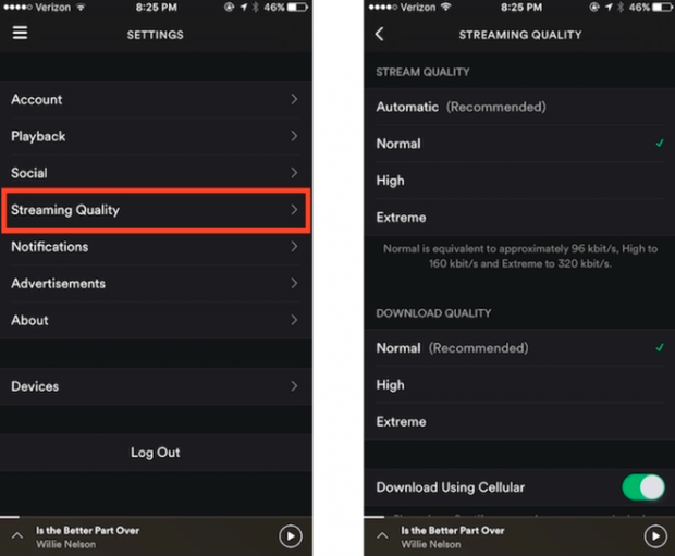 Apple Music, Spotify hay một số ứng dụng nghe nhạc của Việt Nam như Nhaccuatui, Zingmp3 đều cho phép chọn lựa chất lương nhạc khi nghe trực tuyến. Chất lượng thấp hơn đồng nghĩa với việc ngốn ít dung lượng 3G hơn.