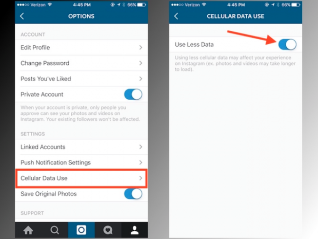 Để tiết kiệm dữ liệu 3G, nên lựa chọn chế độ sử dụng ít dữ liệu hơn (Use Less Data) trong phần Options. Điều này không làm ảnh hưởng đến chất lượng ảnh và video hiển thị trên Instagram.