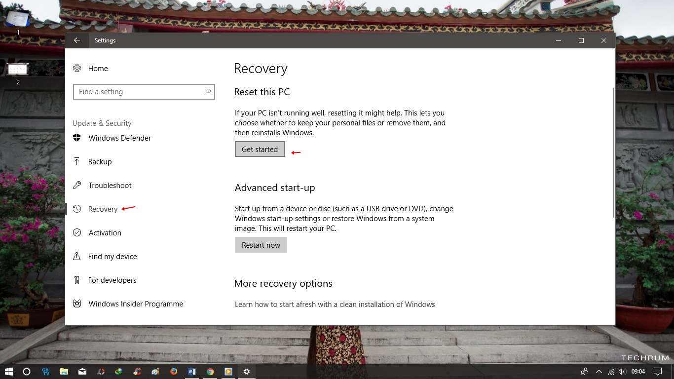 Bước 2: Nhấp vào nhóm thiết lập Recovery và nhấn vào lựa chọn “Get started” ở thiết lập Reset this PC.