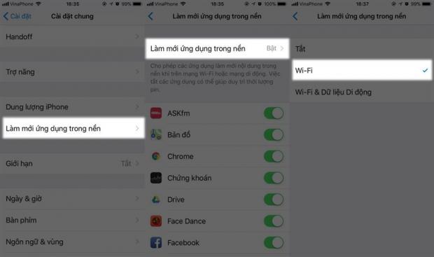 Đối với iOS 11, Apple đã bổ sung cho các bạn có thể chuyển qua chỉ hoạt động khi có Wifi, cách làm cũng tương tự: Cài đặt chung > Làm mới ứng dụng trong nền > Wifi là được.