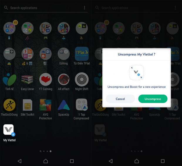 App sau khi gỡ sẽ có icon của app đó nhưng mất màu, bạn có thể nhấn vào app để giải phóng ứng dụng trở lại, hoặc vào icon Compressed Apps để trả app về như cũ.