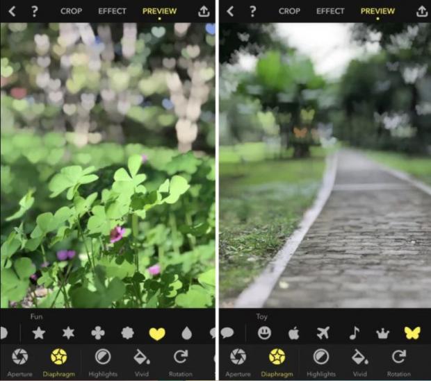 Focos còn có thể tạo hình cho bokeh, một tính năng độc đáo chưa có trên ứng dụng nào trước đây. Như ảnh ở dưới chúng ta có thể thấy tùy chọn hình trái tim hoặc hình con bướm cho bokeh.