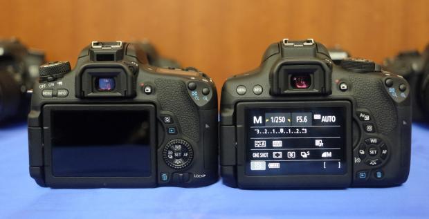 Phía sau máy ảnh là màn hình cảm ứng 3 inch độ phân giải 1,04 triệu điểm ảnh. Các tính năng khác trên hai máy DSLR mới của Canon còn là tích hợp Wi-Fi, NFC và hỗ trợ quay video Full HD 1.080p với 30 khung hình/giây