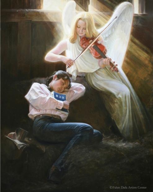 Trần Tiếu Bình cho biết, Bài ca thiên sứ đến từ một câu chuyện có thật: Một nữ học viên Pháp Luân Đại Pháp người Mỹ là một nghệ sĩ thanh nhạc; sau khi tới Trung Quốc du lịch, cô bị cảnh sát Trung Quốc bắt lên xe chỉ vì lên tiếng ủng hộ Pháp Luân Công. Lúc đầu cảnh sát rất hung ác, nhưng khi cô hát lên bài ca mỹ diệu bằng tiếng Trung, cảnh sát đều bị cô cảm động rơi nước mắt. Trần Tiếu Bình nói, sau khi đọc câu chuyện này, cô rất cảm động nên đã sáng tác bức họa này. Cô hy vọng câu chuyện này có thể cảm động tất cả người xem. Bài ca thiên sứ có thể khiến cảnh sát tà ác rơi lệ, nhờ đó ngăn họ hành ác. Từ đó có thể thấy, lực lượng của từ bi và thuần thiện là to lớn và mỹ diệu như thế nào!