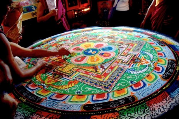 Nhờ có Chak-Pur, một công cụ để cát pha trộn với thuốc nhuộm tự nhiên, những bức vẽ vô cùng tỉ mỉ được thành hình để sau đó trở thành những tác phẩm nghệ thuật thực sự. Như thấy trong bức ảnh, các nhà sư Tây Tạng phải dùng một dụng cụ đầu nhọn để đưa những hạt cát vào bức tranh…