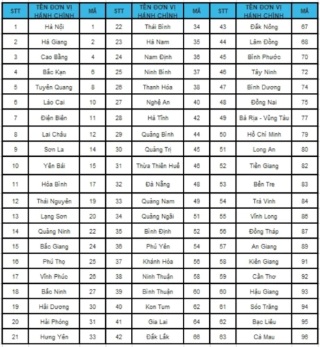 Chi tiết bảng mã của 63 tỉnh thành trên Việt Nam :