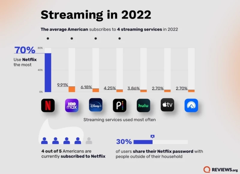 Reviews.org cho biết trung bình người Mỹ đăng ký 4 dịch vụ phát trực tuyến vào năm 2022. Trong số 1.000 người trả lời khảo sát, 78% đăng ký Netflix, 46% đăng ký Disney +, 42% đăng ký HBO Max, 33% đăng ký Peacock, với 26% đăng ký Hulu. 22% đã đăng ký Apple TV +.