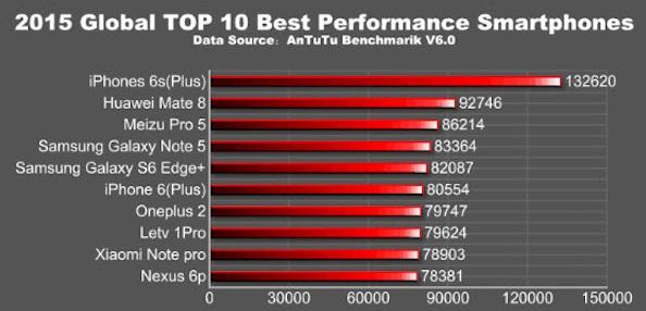 Theo danh sách này, Iphone 6s dẫn đầu bảng với điểm benchmark lên đến 132620, cao hơn rất nhiều so với con số 92746 của smartphone đứng thứ 2 là Huawei Mate 8, chiếc Meizu Pro 5 xếp thứ 3 với 86214 điểm, sau đó mới đến 2 smartphone cao cấp của Samsung là Samsung Galaxy Note 5 và Samsung Galaxy S6 Edge.
