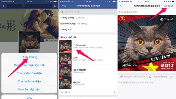 Tại menu cài đặt nhanh chọn mục Thêm khung > tiếp tục chọn khung U20Vietnam và nhấn Áp dụng để lưu.