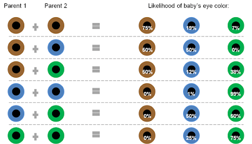 Có đến 74% màu sắc của đôi mắt được quyết định bởi gen với tên khoa học là OCA2 và nó nằm ở trên nhiễm sắc thể số 15. OCA2 cũng là mẫu gen có tác động mạnh mẽ nhất đến màu tóc và màu sắc của da. Bên cạnh đó, màu mắt cũng có thể được quyết định do tác động từ yếu tố ánh sáng tương tác với tròng mắt của từng người.