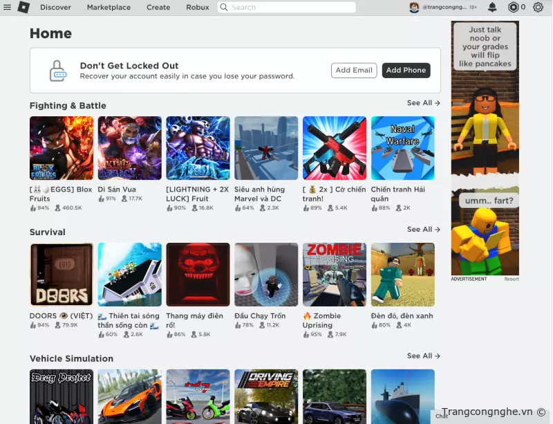 B2 : Sau khi đăng ký thành công bạn sẽ được chuyển tới giao diện chính của Roblox với hàng triệu game khác nhau