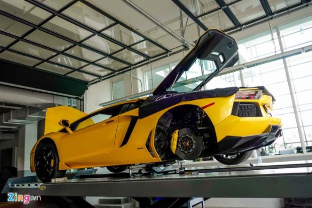 Chiếc Lamborghini Aventador đầu tiên tại Việt Nam có mặt từ sáng sớm. Các kỹ thuật viên của xưởng dùng máy nâng thủy lực đưa xe lên cao để thay lốp.