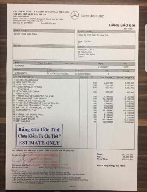 Cùng với đó, người này đăng kèm ảnh bảng kê tạm tính của đại lý Mercedes-Benz cho chiếc E200 (trị giá mua mới khoảng 2,1 tỷ đồng) cho gói phục hồi nguyên trạng xe vào khoảng 169 triệu đồng, trong đó phần nặng nhất là thay mới nắp ca-pô trước (hơn 42 triệu đồng) và cụm đèn pha phải (hơn 61 triệu đồng).