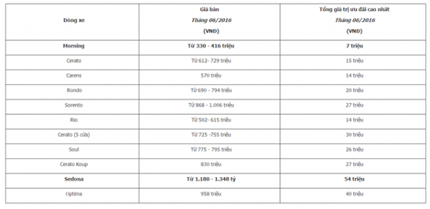 Giá bán các dòng xe Kia sau khi được giảm giá, ưu đãi.