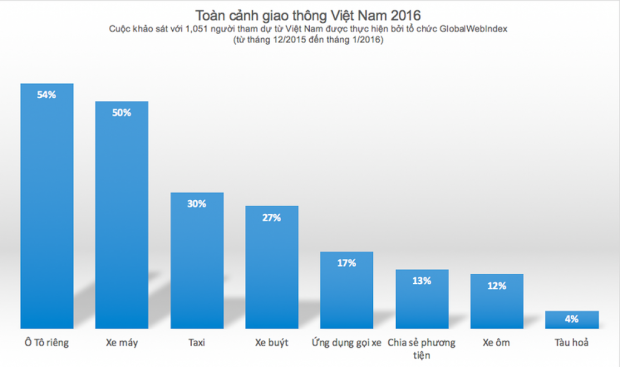 Xe gắn máy, xe tay ga đứng đầu trong danh sách các phương tiện được sử dụng thường xuyên bởi người Việt, với 38% người tham gia trả lời đồng ý rằng họ sử dụng xe gắn máy nhiều hơn so với năm trước đó. Ô tô cá nhân là phương thức tiếp theo có xu hướng sử dụng tăng lên, với tỉ lệ 36% người được hỏi chia sẻ rằng họ dùng xe ô tô cá nhân thường xuyên hơn, tiếp đến là taxi (với 24%) và các ứng dụng gọi xe (23%).