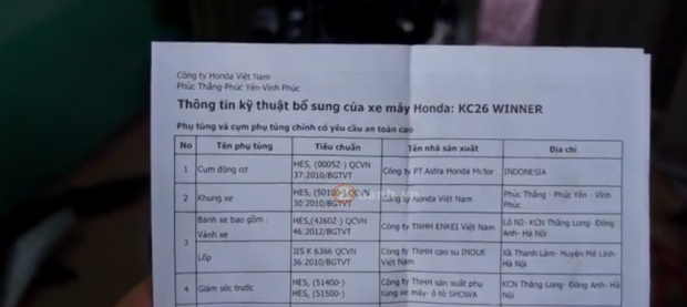 Trên một diễn đàn chuyên về mô tô và xe máy tại Việt Nam đã xuất hiện ảnh chụp tài liệu ghi rõ nguồn gốc xuất xứ của các bộ phận chính của Honda Winner 150. Trong đó, chi tiết được nhiều người quan tâm nhất là khối động cơ của Honda Winner 150.
