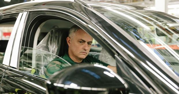 Mourinho trong đồng phục của Jaguar và đi thẳng đến khu vực sản xuất để theo dõi, hỗ trợ nhân viên và di chuyển dọc dây truyền sản xuất trong quá trình xây dựng nên chiếc xe của minh.