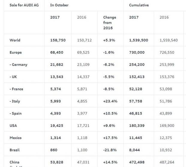 Ở chiều ngược lại, thị trường Anh lại cho thấy sự sụt giảm khá mạnh và ảnh hưởng tiêu cực tới doanh số của Audi trên toàn bộ khu vực châu Âu. Theo đó, doanh số tháng 10 tại Anh đã lao dốc 5,5% so với cùng kỳ năm 2016 và 0,6% tính từ đầu năm. Ngoài Anh, Pháp là một thị trường khác mà Audi có kết quả kinh doanh khá bi đát với 5.374 xe được tiêu thụ, giảm tới 8,5%. Tính trên toàn châu Âu, Audi đã bán được tổng cộng 68.450 xe trong tháng 10, giảm nhẹ 1,6% so với một năm trước.