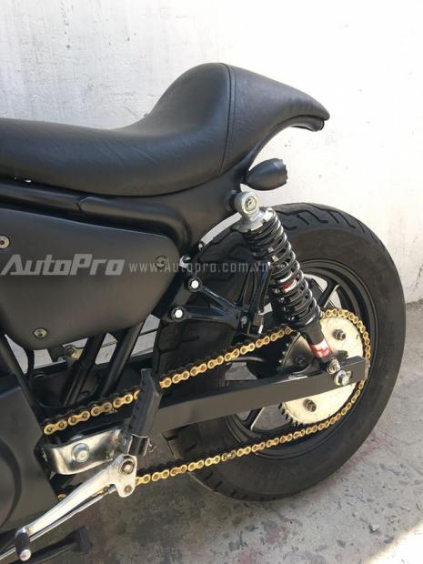 Thay cho loại yên 2 tầng trên Yamaha Virago 125, mẫu xế độ được tạo dáng phần yên theo phong cách café racer. Cặp phuộc sau của YSS, nhông sên dĩa vàng và cặp lốp của Dunlop.