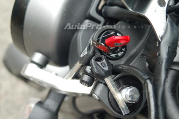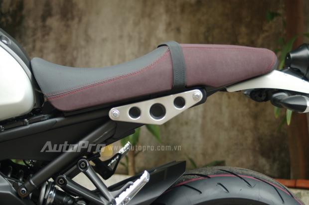Ổ khóa yên nằm dưới vè chắn bùn được trang bị thêm nắp che đậy khá tiện lợi. Phần yên của Yamaha XSR900 được tháo rời hoàn toàn, trong đó phía dưới yên là đầu cắm dùng để kết nối máy tính khi cần xóa lỗi.
