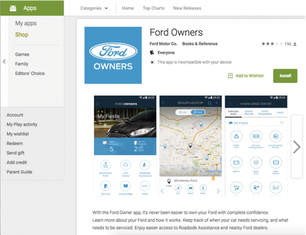 Ứng dụng Chủ sở hữu xe Ford giúp người dùng tận dụng tối đa phương tiện của họ. Ứng dụng sẽ hiển thị lịch bảo dưỡng, chỉ đường trực tiếp tới đại lý Ford gần nhất. Người dùng có thể dễ dàng đặt lịch dịch vụ chăm sóc, đồng thời tra cứu thông tin về xe và hệ thống nhận diện giọng nói SYNC. Ứng dụng đồng thời cũng cung cấp một cách tiếp cận dễ dàng tới các nguồn hỗ trợ và nhận thông báo về các sản phẩm, ưu đãi mới.