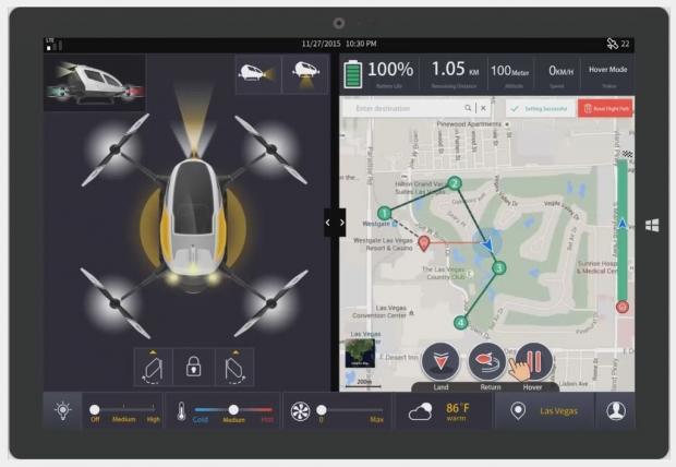Một máy tính bảng và một ứng dụng trực quan giúp phục vụ cho giao diện người máy, và việc lái chiếc Ehang 184 không đòi hỏi phải đào tạo nhiều vì mọi thứ đều chạy tự động. Tuy nhiên người dùng có thể chọn nhiệt độ AC, cảm biến và ánh sáng bên ngoài, hoặc cài đặt chế độ cân bằng hoặc chế độ lái sinh thái. Về mặt ổn định, Ehang 184 có thể thích ứng với các yếu tố ngoài môi trường nhằm đảm bảo một chuyến bay ổn định và êm ái thậm chí trong những điều kiện nhiều gió.
