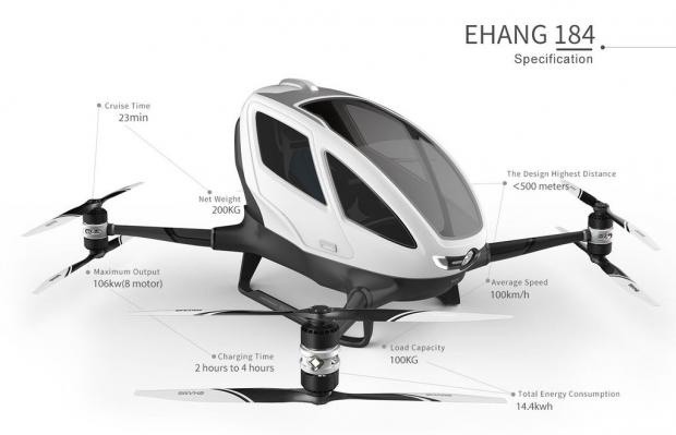 Tám động cơ 142 mã lực có thể đẩy Ehang 184 lên tới tốc độ tối đa 100 km/h với độ cao tối đa 500 mét. Một bộ sạc đầy đủ có thể cho phép một chuyến bay 23 phút, và nếu là một chuyến bay tốc độ cao thì trông chiếc Ehang 184 như đang trong phim hành động Sci-Fi vậy. Một bộ sạc đầy đủ có thể chạy được lên tới 4 tiếng cho phép một chuyến đi vui vẻ sau giờ làm.