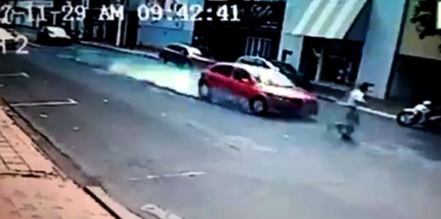Ngay khi phát hiện ra tình huống, tài xế xe sedan đã đạp phanh cháy lốp. Nhưng do đang đi tốc độ cao, chiếc xe không tránh được cú đâm vào người đàn ông.