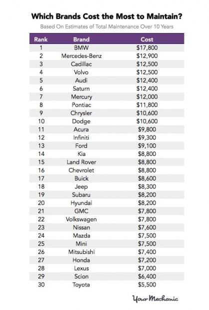Như vậy theo bảng xếp hạng chi phí nuôi 1 chiếc BMW trong 10 năm (17.800 USD) trung bình sẽ tốn gấp 3 lần so với 1 chiếc Toyota (5.500 USD).