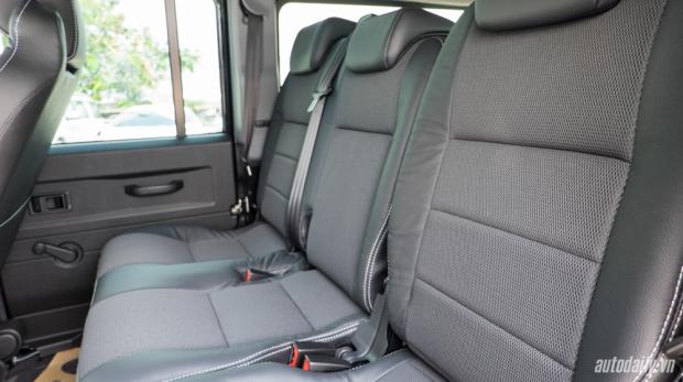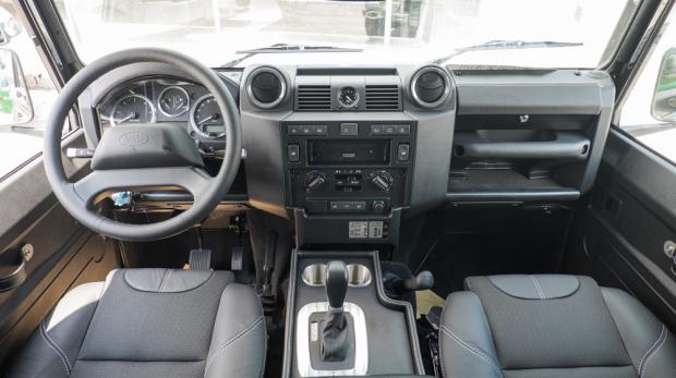 Bên trong, nội thất đi theo hướng tối giản. Vô lăng không có bất cứ nút bấm nào, điều hòa một vùng cùng ghế ngồi bọc da và nỉ. Thậm chí, cửa kính hàng ghế thứ 2 vẫn phải mở bằng cách quay thủ công. Hàng ghế thứ 3 chỉ có thể tiếp cận từ phía cửa cốp thay vì gập hàng ghế thứ 2 như thông thường. Xe có sưởi kính, đồng hồ analog ở trung tâm, cần gài cầu và 2 cửa sổ trời nhỏ. Dòng ‘1948-2015’ được khắc chìm ở cụm đồng hồ. Sự đơn giản của Defender 1948-2015 X-Spec Edition là bởi đây là dòng xe chuyên off-road, nên mọi thứ đều phải dễ dàng sửa chữa hoặc thay thế.