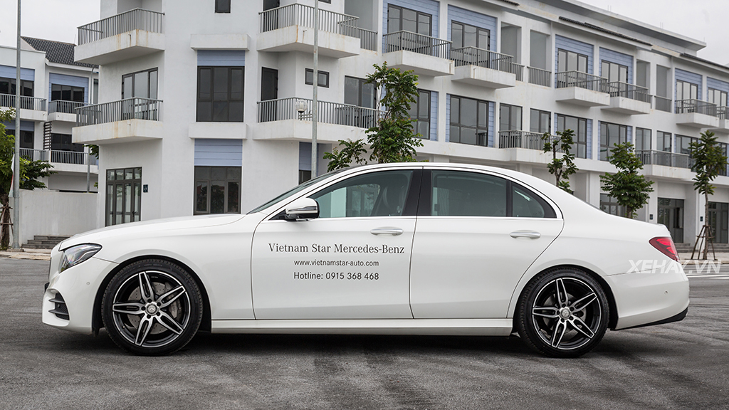 Chi tiết dễ phân biệt nhất giữa 3 dòng C E S là đường gân dập nổi trên thân xe. Trong khi đường gân này trên C và S-Class bắt đầu từ cụm đèn trước và được hạ thấp dần đến vòm bánh xe sau thì đường gân của E-Class cũng bắt đầu từ cụm đèn trước nhưng chạy xuyên qua tay nắm cửa và kết thúc ở cụm đèn hậu. Chi tiết này tạo ấn tượng chiếc E-Class dài hơn và thanh thoát hơn. Gói ngoại thất AMG mang lại bộ la-zăng 2 màu tương phản kích cỡ 19 inch tuyệt đẹp.