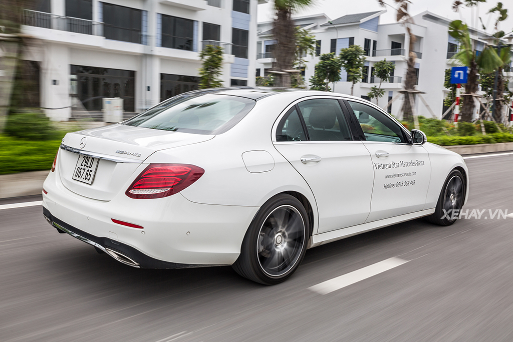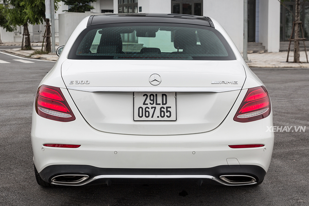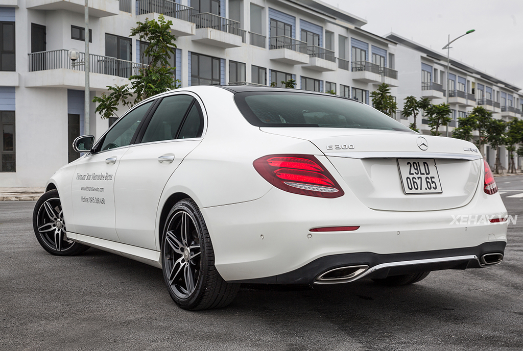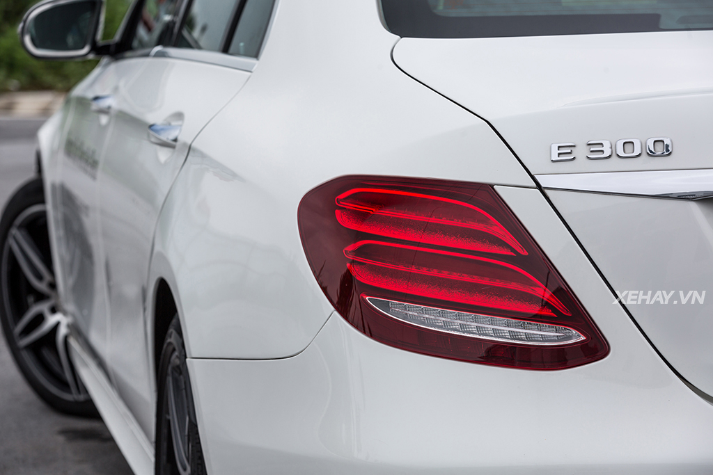 Ở phía đuôi, cụm đèn hậu dạng LED cũng có thiết kế 3 tầng giống như C-Class nhưng 2 dải đèn phanh được tạo hình 3D hơn với hiện ứng “ngàn sao” rất đẹp mắt. Nhìn chung, E-Class là một chiếc sedan có vẻ đẹp đầy tinh tế và ấn tượng.
