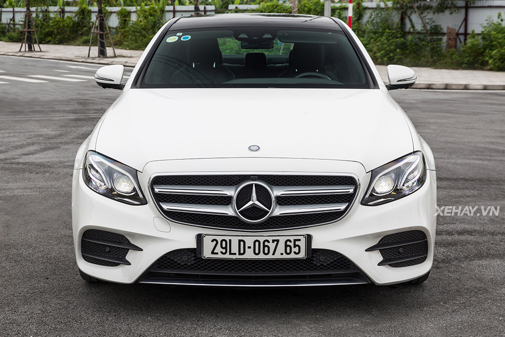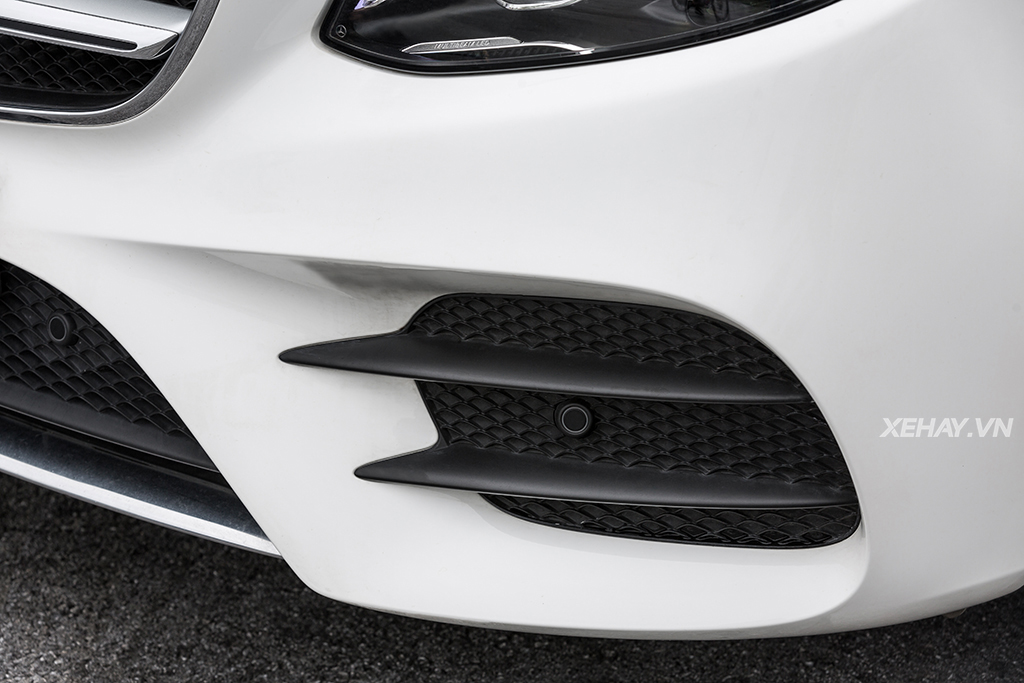 Một điểm nhấn khác ở phần đầu xe là lưới tản nhiệt hình thang có điểm xuyết 2 nan mạ crôm ôm gọn biểu tượng ngôi sao ba cánh. Nêu tinh ý một chút, bạn sẽ thấy mẫu E300 AMG này có thêm logo ngôi sao ba cánh trên nắp capô dạng phẳng thay vì dạng đứng giống như đời W212. Thấp hơn một chút, tấm cản va hình chữ A với 2 hốc gió có các nan màu đen khá giống với dòng GLC. Nhìn chung, các chi tiết được tính toán cẩn thận đã kết hợp và tạo nên một vẻ mặt thực sự bắt mắt cho Mercedes E300 AMG.