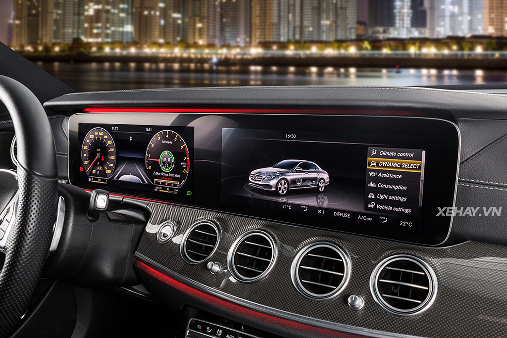 Cặp màn hình đôi kích cỡ 12.3 inch là điểm thu hút sự chú ý của mọi hành khách bước lên xe. Màn hình bên trái hiển thị cụm đồng hồ và một số thông tin cho người lái, màn hình bên phải phục vụ nhu cầu thông tin giải trí. So với màn hình đôi của S-Class thì hệ thống trên E-Class W213 có độ nét, độ tương phản, màu sắc và độ phân giải không hề kém cạnh. Cá nhân tôi còn thấy cách sắp xếp màn hình của E-Class còn đẹp hơn vì không có 1 hàng phím chức năng chèn giữa 2 màn hình giống như S-Class. Trên E-Class thì đó chỉ là một khoảng đen nhìn liền mạch và ấn tượng hơn.