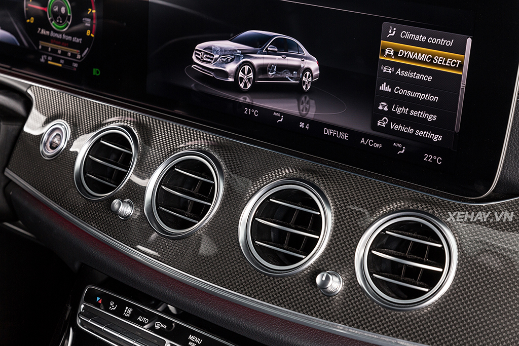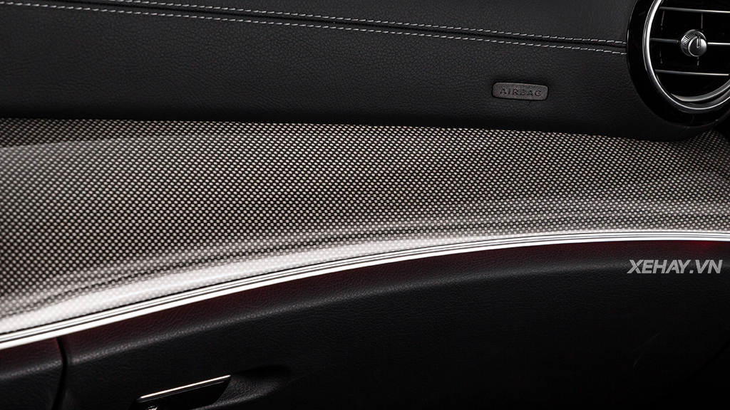 Thiết kế bảng táp lô của E300 AMG rất tương đồng với đàn anh S-Class với cụm cửa gió điều hòa hình tròn bằng kim loại và cụm phím điều hòa được tạo hình uốn lượn như những phím dương cầm. Bảng táp lô được ốp sợi kim loại sắp xếp theo hình ca rô rất độc đáo. Tôi đã thử tìm hiểu E300 AMG ở một số thị trường khác nhưng có vẻ như chỉ phiên bản lắp ráp tại Việt Nam mới có kiểu bảng táp lô bằng sợi kim loại này.