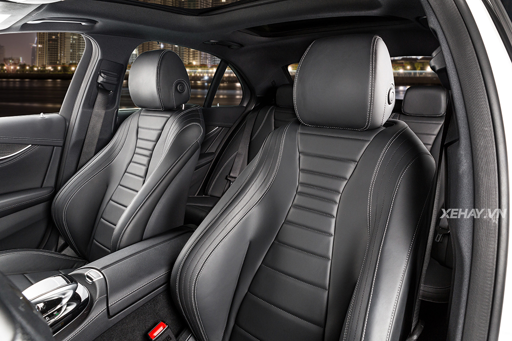 Ghế ngồi của chiếc E300 AMG được bọc da thật, khá êm ái và có mùi dễ chịu. Ghế được tạo hình theo cột sống con người và có những tấm đệm đỡ bên hông rất dày dặn và êm ái, thứ sẽ giữ bạn ít bị trượt sang ngang khi xe vào cua gấp. Hai ghế trước chỉnh điện và nhớ 3 vị trí, bao gồm cả vị trí vô lăng và vị trí gương. Khách hàng cũng có thể chọn bọc da Designo cao cấp để sở hữu một trong những loại da bọc ghế hảo hạng nhất phân khúc.
