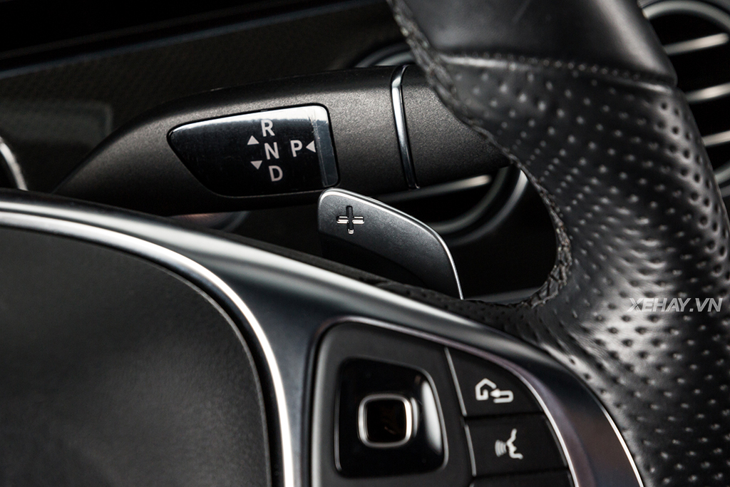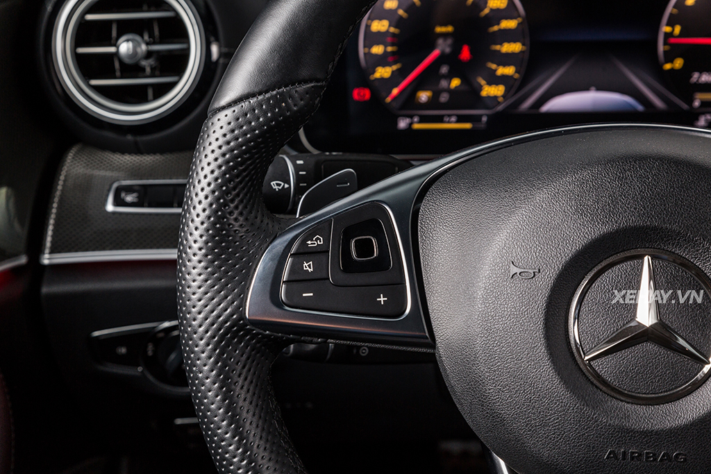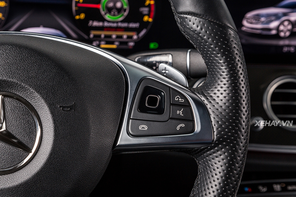 Chiếc vô lăng đáy bằng, 3 chấu của E300 AMG mang thiết kế thể thao, được bọc da đục lỗ thông gió và cho cảm giác cầm nắm rất thật tay. Bên cạnh các phím điều hướng truyền thống thì còn có một chi tiết lần đầu tiên xuất hiện trên xe Mercedes-Benz: hai phím cảm ứng được đặt trên vô lăng. Hai phím cảm ứng này thay thế phím điều hướng thông thường và chúng nhạy bén như màn hình điện thoại thông minh vậy. Tuy nhiên, đôi lúc chúng nhạy quá khiến tôi khá bỡ ngỡ. Dù vậy, sau khi đã quen thì tôi lại thích thao tác cảm ứng này.