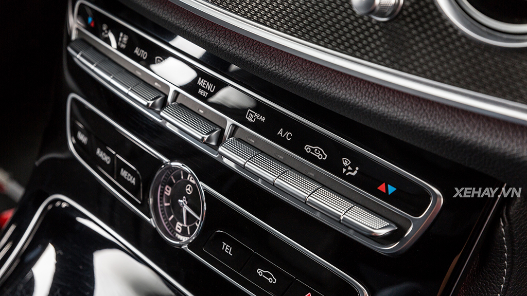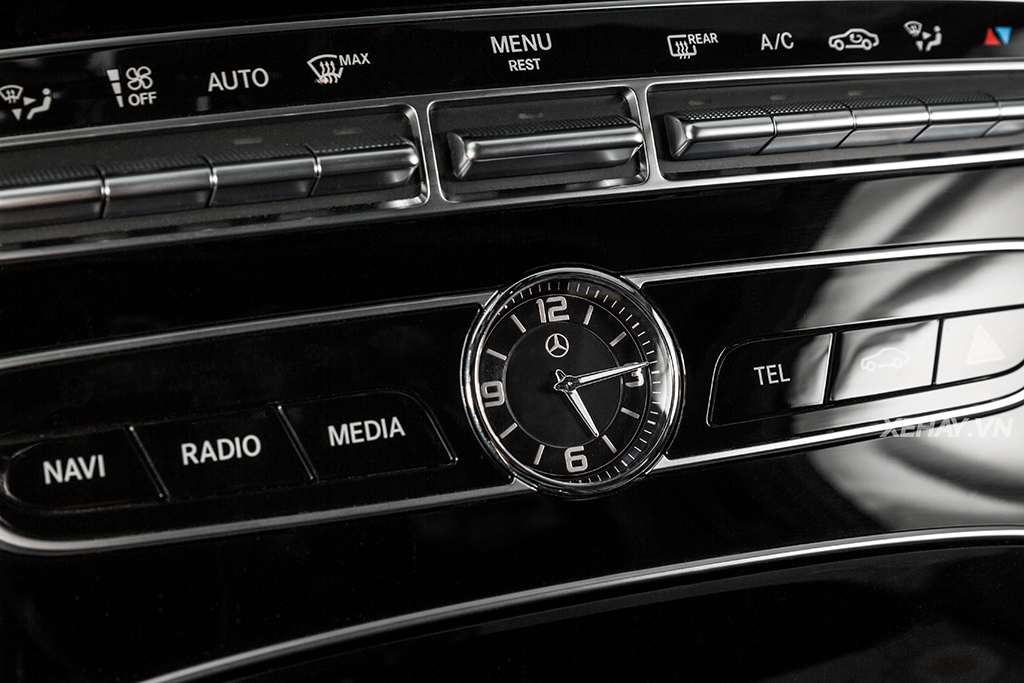 Khu vực bảng điều khiển trung tâm cũng được tạo hình theo phong cách tối giản: một đồng hồ cơ ở chính giữa và các phím chức năng được đặt đối xứng. Bên dưới là bàn điều khiển, con lăn đặc trưng của hệ thông tin giải trí COMMAND ONLINE và các phím chế độ lái. Những thao tác giao tiếp với chiếc xe bằng bàn rê cảm ứng, con lăn và các phím cứng là tương đối dễ hiểu nhưng có lẽ sẽ tốt hơn nếu Mercedes cung cấp khả năng cảm ứng cho những chiếc màn hình cỡ lớn của E-Class.